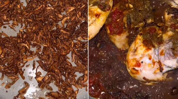 وأوضح أنه أول خطوة يتم تحمير البصل حتى يكون لونه بني، ثم يتم وضع قطع الدجاج بدون جلد ويكون طازج ويتم تقليبه جيدا وإضافة مشروم وطماطم وبهارات مشكلة.