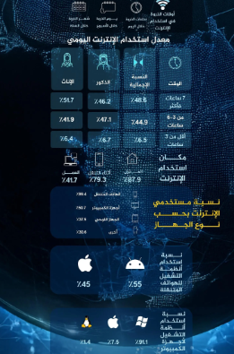 وبيّن التقرير أن الإنترنت يُستخدم غالبًا من المنزل بنسبة (87.9%)، يليه الاستخدام أثناء التنقل بنسبة (79.3%)، ثم أثناء العمل بنسبة (41.7%).
