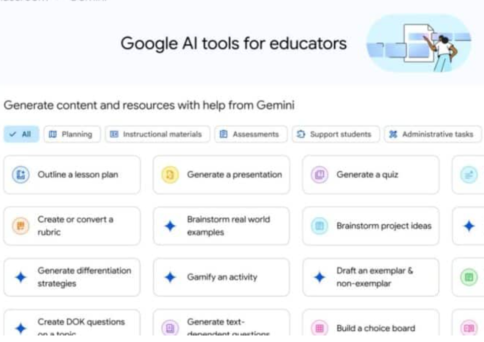 وبدأ المعلمون الذين يملكون حسابات في منصة Google Workspace الحصول على تبويب خاص بأدوات Gemini داخل منصة Classroom، مما يتيح لهم الاستفادة من الذكاء الاصطناعي في صياغة خطط الدروس، وإنشاء مسائل رياضية، وكتابة رسائل البريد الإلكتروني وغيرها. وأما مستخدمو إصدار Education Plus، فسيحصلون أيضًا على دروس صوتية باستخدام Gemini تُقدّم كمحتوى إضافي.