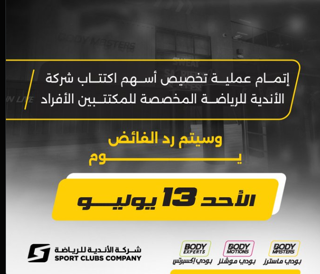 إتمام عملية تخصيص أسهم اكتتاب شركة الأندية للرياضة المخصصة للمكتتبين الأفراد، وسيتم رد الفائض اليوم الأحد 13 يوليو