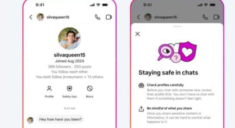 وفي سياقٍ متصل، أضافت الشركة مزايا جديدة لحماية المراهقين، منها إظهار تاريخ انضمام الحساب إلى إنستاجرام في أعلى المحادثات الجديدة، مع إتاحة خياراتٍ سريعة لعرض نصائح الأمان أو حظر الحساب. كما أصبح بإمكان المراهقين حظر الحساب والإبلاغ عنه بضغطة واحدة، مما يسهّل وصول فرق ميتا المختصة إلى الحسابات المخالفة واتخاذ الإجراء المناسب.