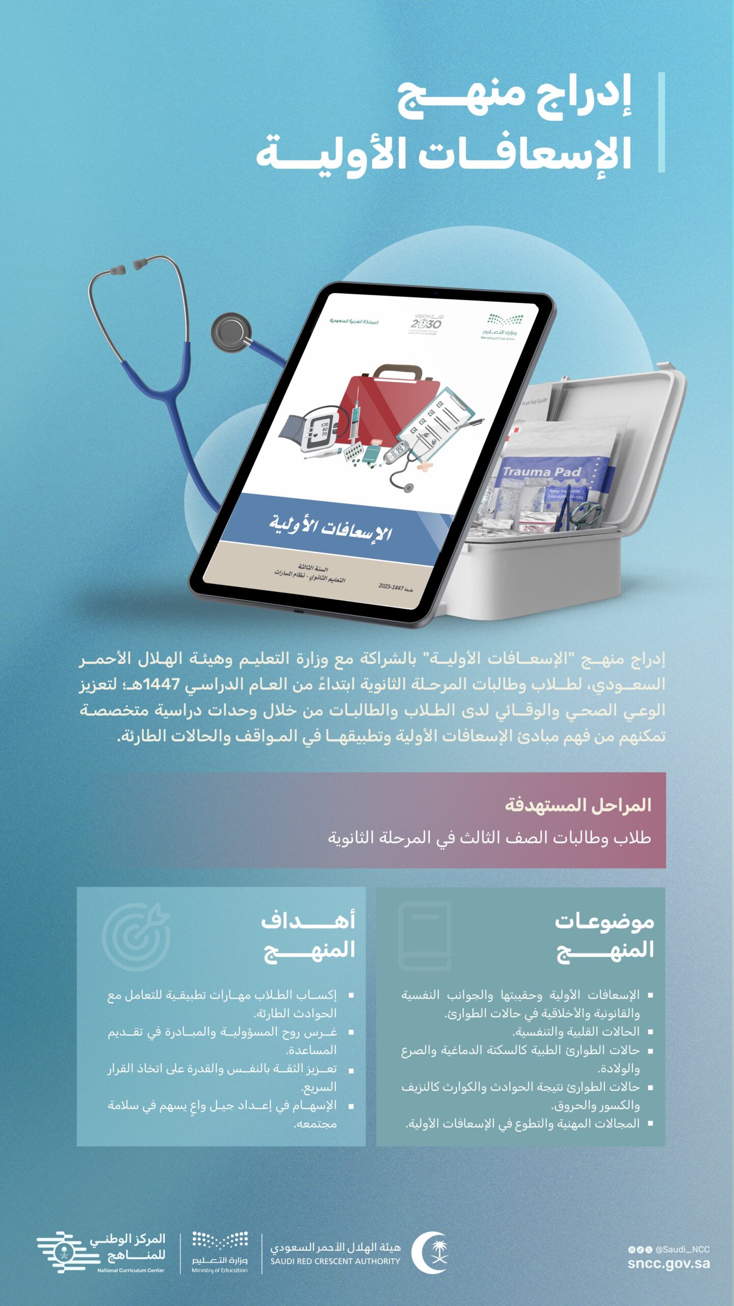 ومن المقرر تطبيق المنهج ابتداءً من العام الدراسي 2025 – 2026م، ليشكل خطوة مهمة في إعداد جيل من الكفاءات الوطنية المؤهلة والقادرة على تعزيز السلامة المجتمعية، والإسهام بفاعلية في نشر ثقافة الإسعافات الأولية في المملكة، بما يتوافق مع أهداف رؤية 2030 في تمكين الشباب ورفع كفاءاتهم المهنية، وإعداد مجتمع واعٍ بصحته وسلامته، قادر على مواجهة مختلف الطوارئ بكفاءة عالية.