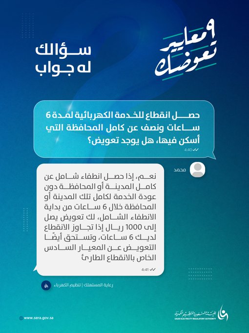 وأكدت أن التعويض يجب أن يُصرف خلال مدة لا تتجاوز عشرة أيام عمل من تاريخ انتهاء الحالة، دون الحاجة إلى تقديم شكوى من المستهلك، سواء بإضافة رصيد في فاتورة الاستهلاك الشهرية أو عبر تحويل مصرفي مباشر.