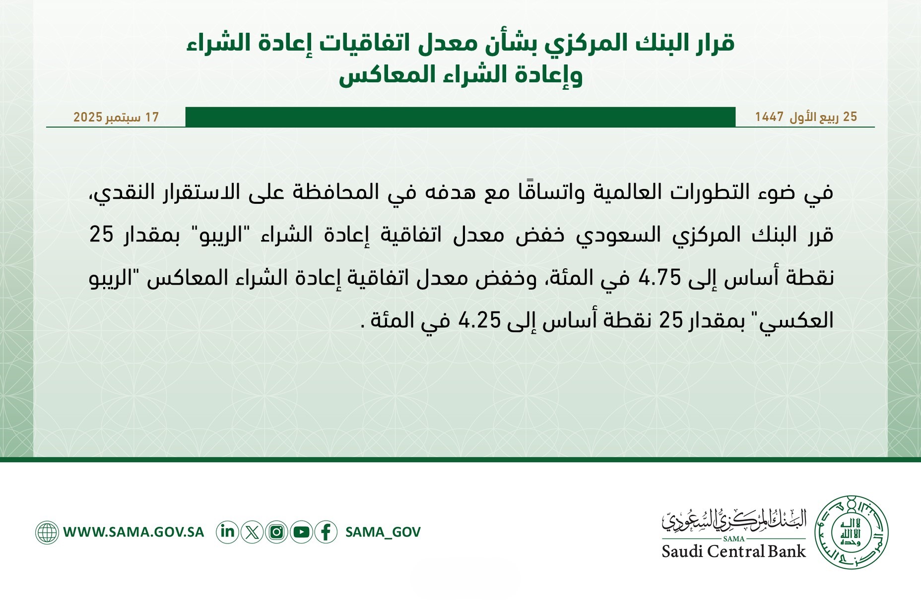 في ضوء التطورات العالمية واتساقًا مع هدفه في المحافظة على الاستقرار النقدي، قرر البنك المركزي السعودي خفض معدل اتفاقية إعادة الشراء “الريبو” بمقدار 25 نقطة أساس إلى 4.75 في المئة، وخفض معدل اتفاقية إعادة الشراء المعاكس “الريبو العكسي” بمقدار 25 نقطة أساس إلى 4.25 في المئة.