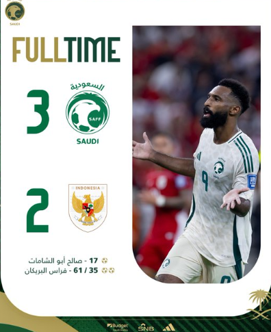حقق المنتخب الوطني فوزًا ثمينًا على نظيره الإندونيسي بثلاثية مقابل هدفين، ليقترب خطوة نحو بلوغ نهائيات كأس العالم 2026، وذلك خلال المواجهة التي جمعتهما اليوم، على ملعب مدينة الملك عبدالله الرياضية بجدة، في افتتاح مباريات المجموعة الثانية من “المحلق الآسيوي” الدور الرابع من للتصفيات الآسيوية المؤهلة لمونديال 2026م.