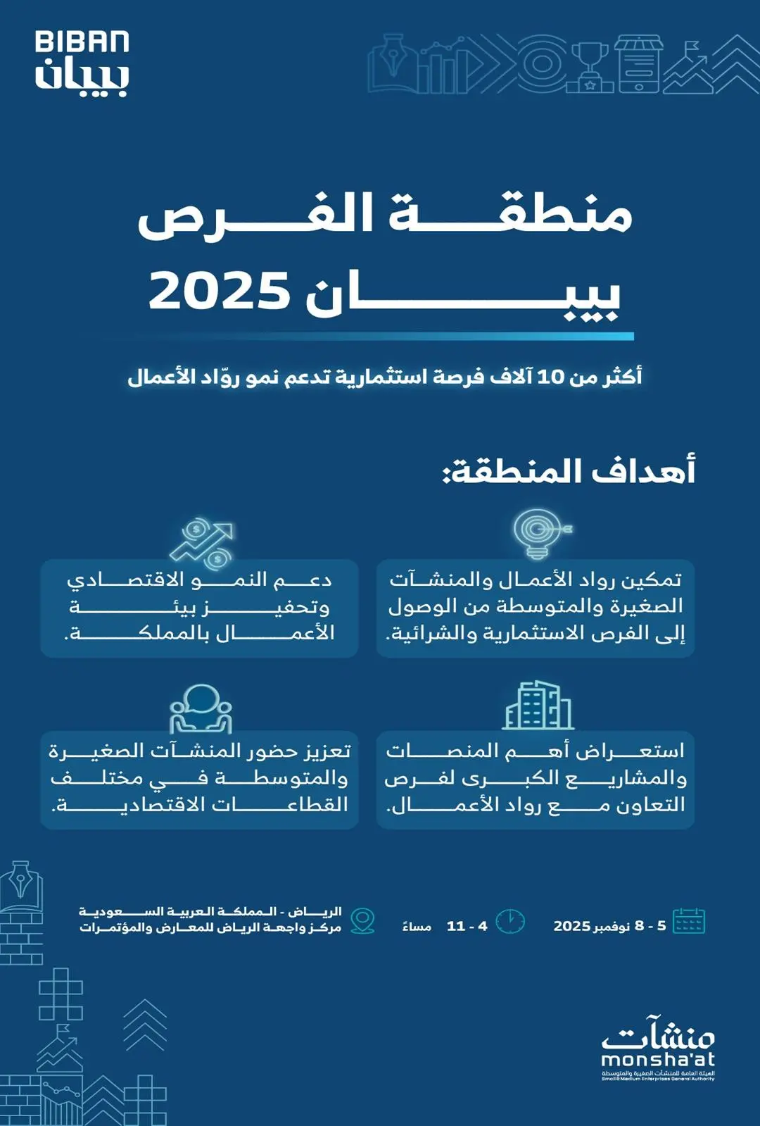 كشفت الهيئة العامة للمنشآت الصغيرة والمتوسطة “منشآت” عن (10) آلاف فرصة استثمارية لرواد الأعمال وأصحاب المنشآت الصغيرة والمتوسطة سيتم استعراضها ضمن “منطقة الفرص” في فعاليات ملتقى “بيبان 2025″، الذي يُقام خلال الفترة من 5 إلى 8 نوفمبر المقبل في مركز واجهة الرياض للمعارض والمؤتمرات تحت شعار “وجهة عالمية للفرص”.