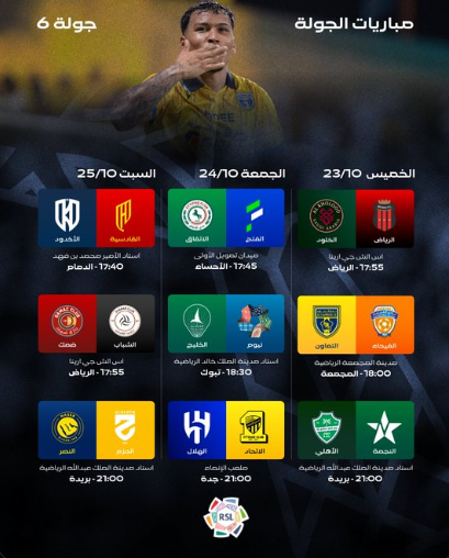 تنطلق غدًا، منافسات الجولة السادسة من الدوري السعودي للمحترفين “دوري روشن”، على مدى ثلاثة أيام، وسط ترقّب جماهيري كبير لمواصلة المنافسة على مراكز الصدارة، التي تشهد تقاربًا في النقاط بين عدد من الفرق بعد مرور خمس جولات.
