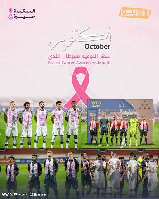 نظمت رابطة أندية دوري الدرجة الأولى للمحترفين بالتعاون مع الشريك الاستراتيجي وجمعية زهرة، مبادرة “أكتوبر الوردي”، وذلك على هامش مباراة الطائي والعلا في الجولة السادسة من دوري يلو لأندية الدرجة الأولى للمحترفين.