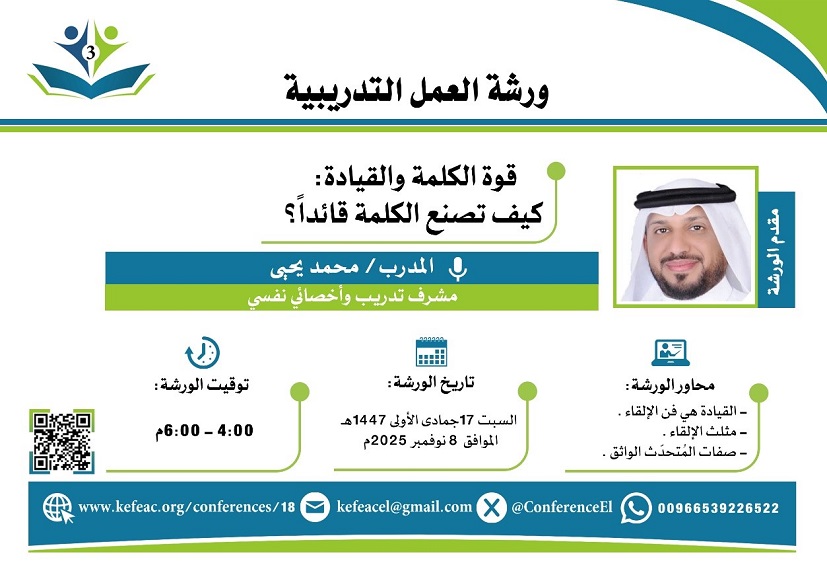 ويُقدَّم ضمن فعاليات المؤتمر يوم السبت 8 نوفمبر 2025م المدرب محمد يحيى الثقفي بورشة عمل بعنوان “قوة الكلمة والقيادة: كيف تصنع الكلمة قائداً؟”.