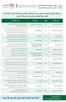ودعا المؤتمر المؤسسات الحكومية والأهلية إلى التقدم لهذه الجائزة المميزة التي تعد أكبر تكريم للباحثين والمبدعين وأصحاب المبادرات الخلاقة التي تسهم في نهضة اللغة العربية ونشرها واستعمالها في دول العالم المختلفة .