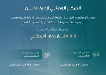 أعلن المركز الوطني لإدارة الدين الانتهاء من استقبال طلبات المستثمرين للإصدار الدولي الأول خلال عام 2026 م للسندات ضمن برنامج سندات حكومة المملكة العربية السعودية الدولي.