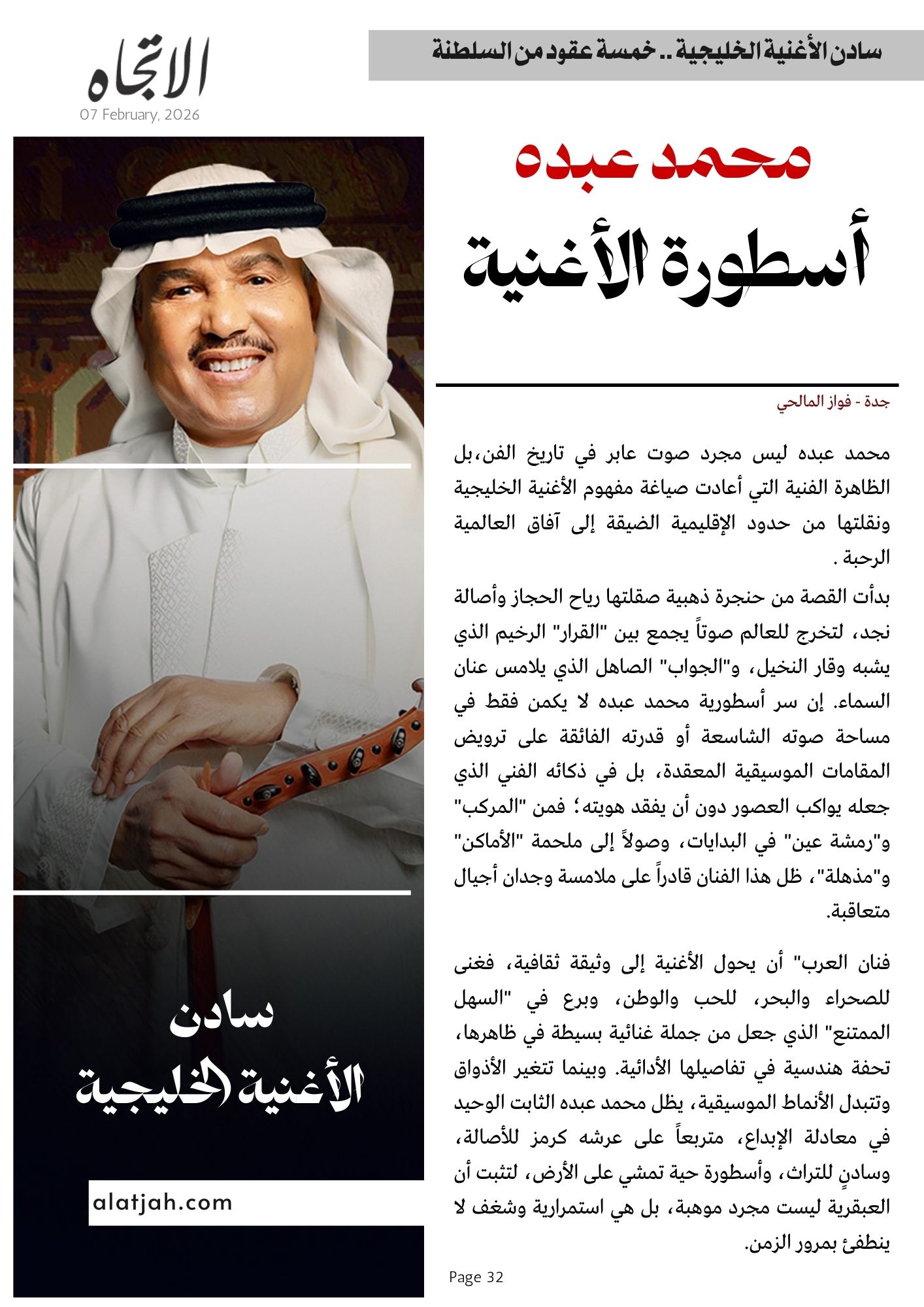 فنان العرب” أن يحول الأغنية إلى وثيقة ثقافية، فغنى للصحراء والبحر، للحب والوطن، وبرع في “السهل الممتنع” الذي جعل من جملة غنائية بسيطة في ظاهرها، تحفة هندسية في تفاصيلها الأدائية. وبينما تتغير الأذواق وتتبدل الأنماط الموسيقية، يظل محمد عبده الثابت الوحيد في معادلة الإبداع، متربعاً على عرشه كرمز للأصالة، وسادنٍ للتراث، وأسطورة حية تمشي على الأرض، لتثبت أن العبقرية ليست مجرد موهبة، بل هي استمرارية وشغف لا ينطفئ بمرور الزمن.