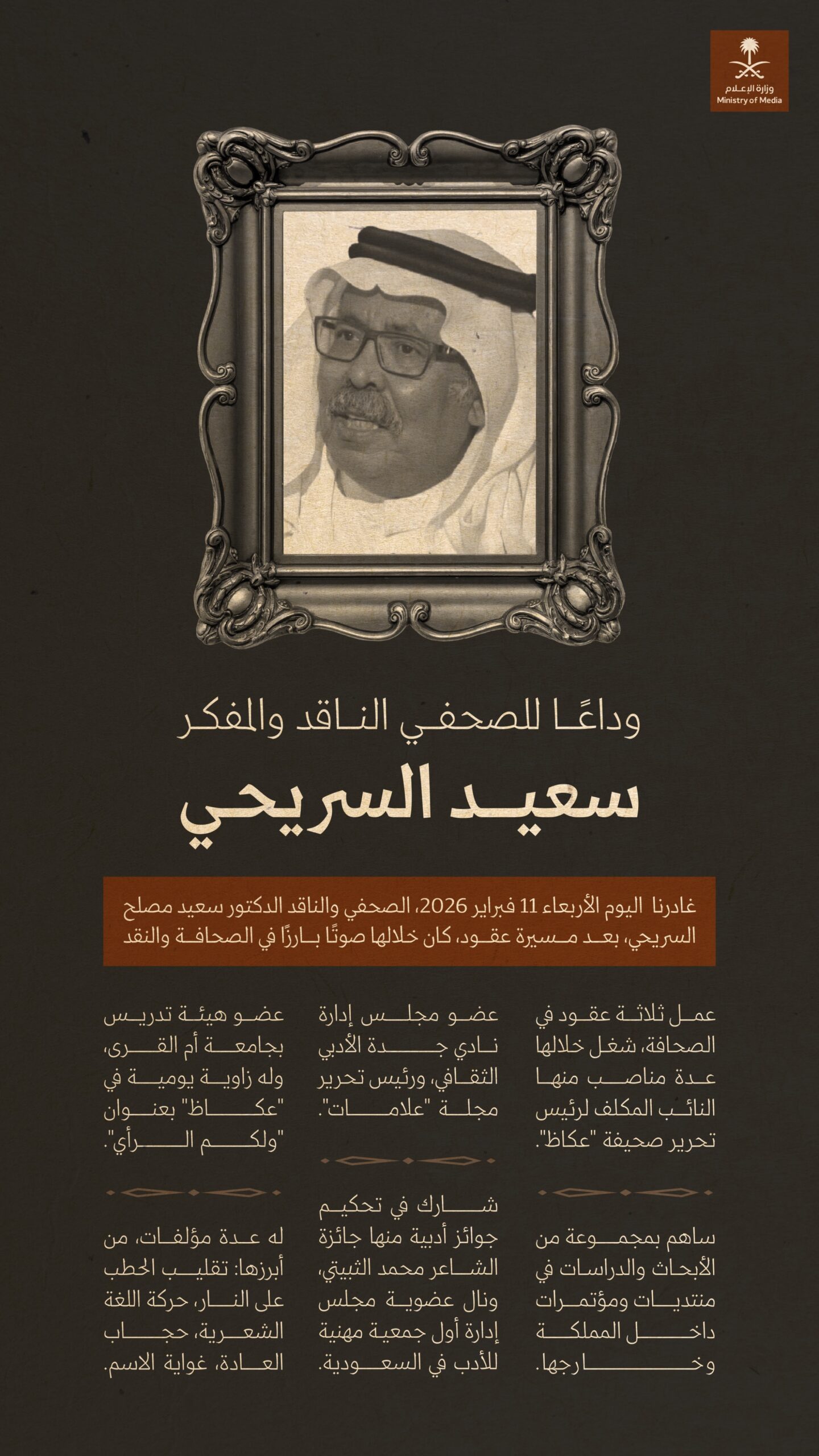 فقدت الساحة الثقافية السعودية والعربية، الأديب والناقد الدكتور سعيد السريحي، الذي توفي بعد معاناة مع المرض عن عمر ناهز 73 عاماً، تاركاً خلفه إرثًا نقدياً وفكرياً شكّل أحد أبرز ملامح مرحلة الحداثة في المشهد الأدبي السعودي.