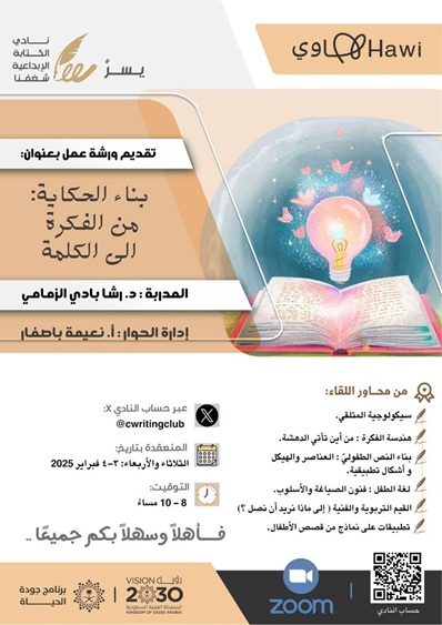 قدّم نادي الكتابة الإبداعية «شغفنا» ورشةً تخصصية في أدب الطفل بعنوان: «بناء الحكاية.. من الفكرة إلى الكلمة»، قدّمتها دكتورة الأدب والنقد والبلاغة رشا بادي الزمامي، وذلك «عن بُعد» على مدى يومين، ضمن الأنشطة المستمرة على منصة «هاوي» الحكومية.