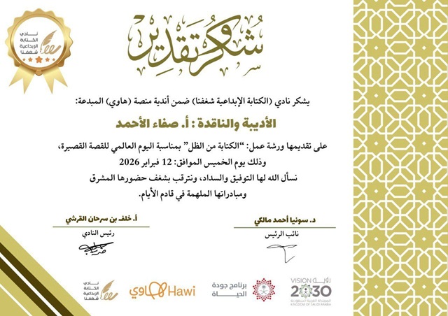 أقام نادي الكتابة الإبداعية شغفنا من منصة هاوي بمناسبة اليوم العالمي للقصة القصيرة مساء امس ورشة بعنوان الكتابة من الظل، مستضيفًا الأديبة والناقدة الأردنية صفاء الأحمد، وذلك ضمن فعالياته الثقافية على منصة هاوي، وسط حضور نوعي من المهتمين بالسرد وفنونه.