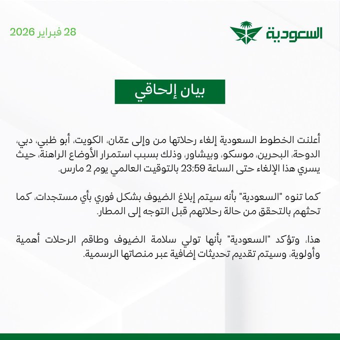أعلنت الخطوط السعودية إلغاء رحلاتها من وإلى عمّان، الكويت، أبو ظبي، دبي، الدوحة، البحرين موسكو وبيشاور، وذلك بسبب استمرار الأوضاع الراهنة، حيث يسري هذا الإلغاء حتى الساعة 23:59 بالتوقيت العالمي يوم 2 مارس.