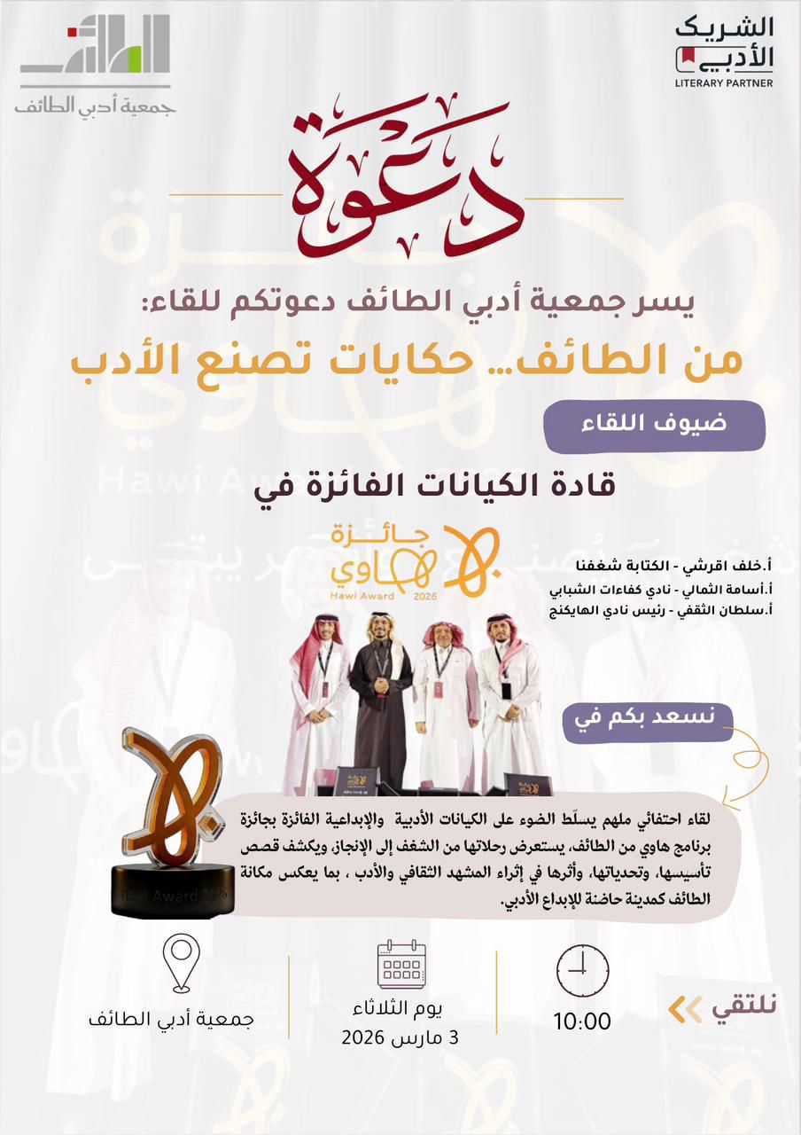 تنظم جمعية أدبي الطائف لقاءً أدبيًا مميزًا بعنوان من الطائف حكايات تصنع الأدب، احتفاءً بقادة الكيانات الأدبية والإبداعية الفائزة بجائزة هاوي 2026، وذلك مساء يوم الثلاثاء الموافق 3 مارس 2026، في تمام الساعة العاشرة مساءً، بمقر الجمعية.