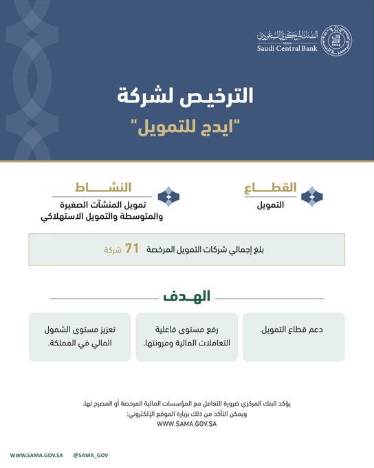 أعلن البنك المركزي السعودي “ساما” الترخيص لشركة “ايدج للتمويل” لمزاولة نشاطي تمويل نشاط المنشآت الصغيرة والمتوسطة، والتمويل الاستهلاكي؛ ليصبح إجمالي عدد شركات التمويل المرخصة في المملكة 71 شركة.
