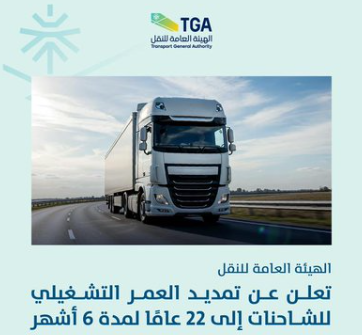 أعلنت الهيئة العامة للنقل تمديد العمر التشغيلي للشاحنات في نشاط نقل البضائع ليصل العمر التشغيلي للشاحنة 22 عامًا وذلك لمدة 6 أشهر حتى 25 سبتمبر من العام الحالي 2026.