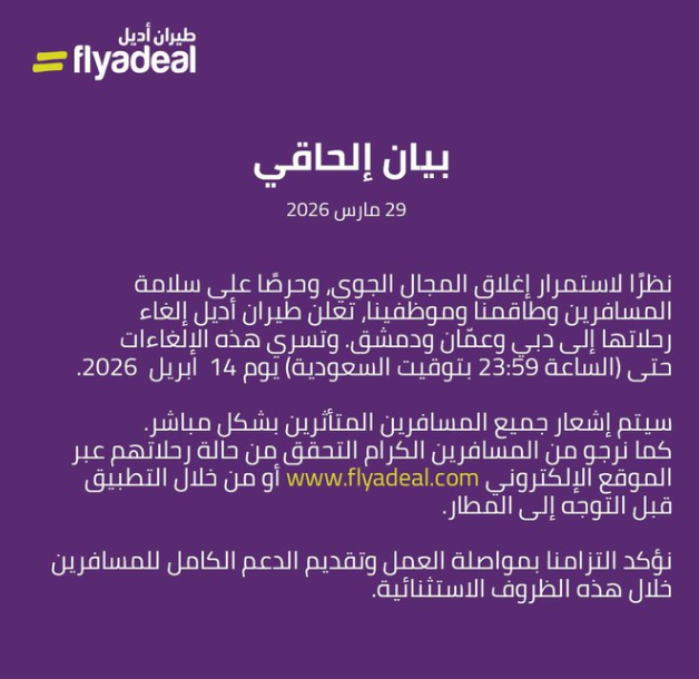 ودعت المسافرين إلى التحقّق من حالة رحلاتهم عبر الموقع الإلكتروني www.flyadeal.com أو من خلال تطبيق الشركة قبل التوجّه إلى المطار.