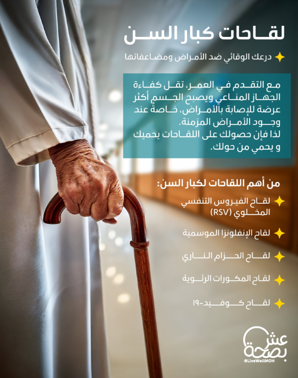 وتابعت، أن لقاحات كبار السن تعد درعا مناعيا؛ لأن كفاءة الجهاز المناعي تقل مع التقدم في العمر ويصبح الجسم أكثر عرضة للإصابة بالأمراض خاصة عند وجود الأمراض المزمنة.