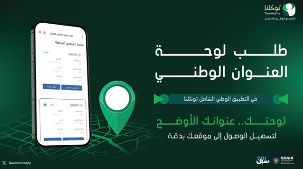 وأوضح «توكلنا» عبر حسابه الرسمي في منصة «إكس» أن بإمكان المستفيدين طلب لوحة العنوان الوطني وتحديد مواقعهم بسهولة عبر التطبيق، بما يسهّل إدارة عناوينهم رقمياً.