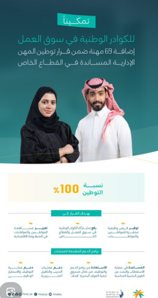أعلنت وزارة الموارد البشرية والتنمية الاجتماعية عن تحديث قرار توطين المهن الإدارية المساندة في القطاع الخاص اعتبارًا من 5 أبريل 2026 ، ليشمل إضافة (69) مهنة ضمن نطاق المهن المشمولة بالتوطين بنسبة 100%، وفقًا للتعريفات والمسميات المهنية المعتمدة في التصنيف السعودي الموحد للمهن، حيث يأتي التحديث ضمن جهود الوزارة الهادفة إلى تعزيز مشاركة الكفاءات الوطنية في سوق العمل، وتوفير فرص وظيفية محفزة ومنتجة للمواطنين والمواطنات في مختلف مناطق المملكة.