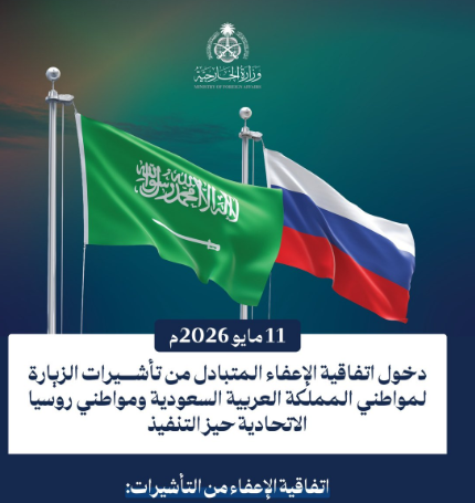 أعلنت وزارة الخارجية دخول اتفاقية الإعفاء المتبادل من تأشيرات الزيارة بين المملكة العربية السعودية وروسيا الاتحادية حيز التنفيذ اعتبارًا من 11 مايو 2026، في خطوة تهدف إلى تسهيل حركة التنقل وتعزيز العلاقات بين البلدين.