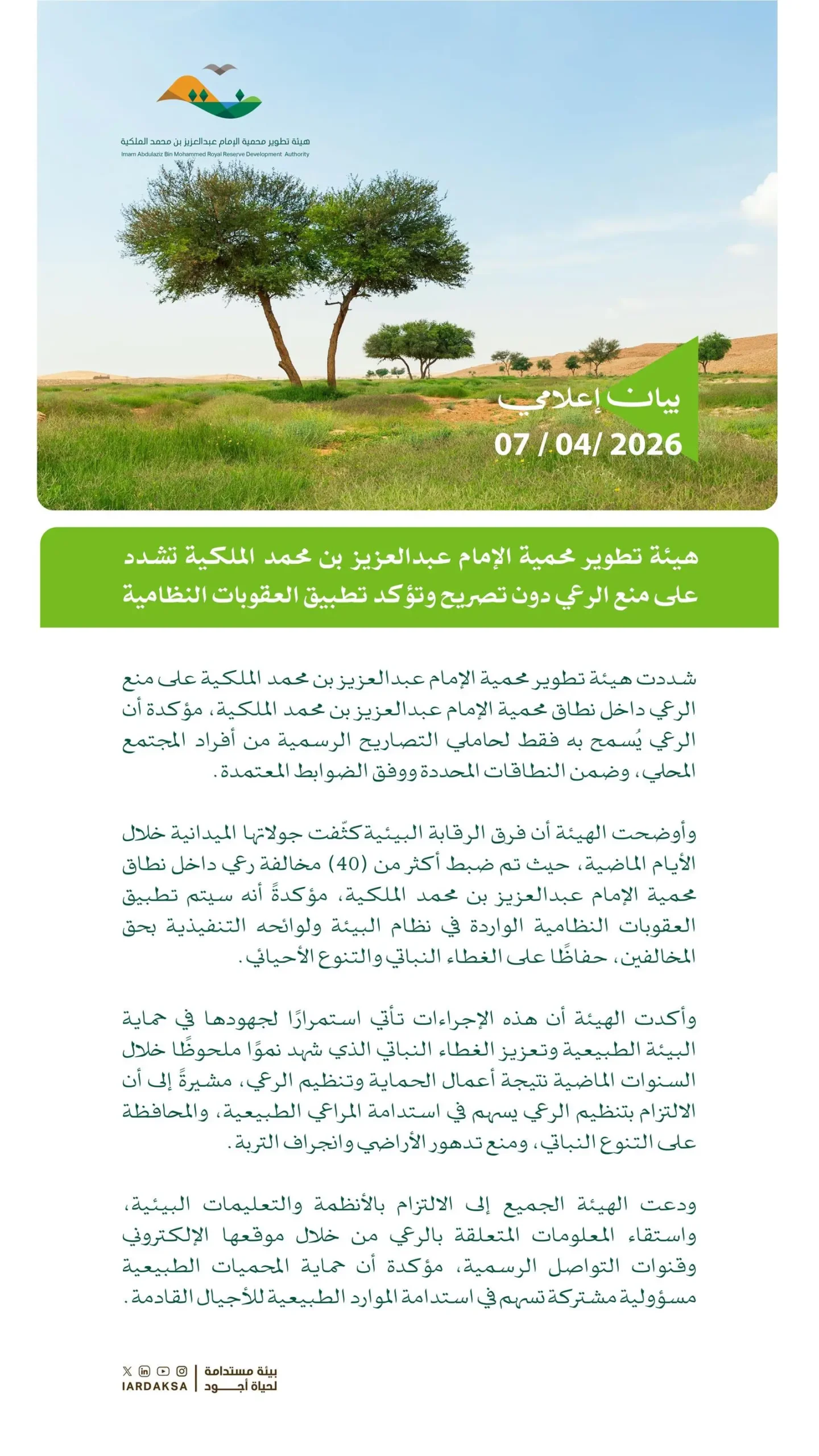 وأكدت الهيئة أن هذه الإجراءات تأتي استمرارًا لجهودها في حماية البيئة الطبيعية وتعزيز الغطاء النباتي الذي شهد نموًا ملحوظًا خلال السنوات الماضية نتيجة أعمال الحماية وتنظيم الرعي، مشيرةً إلى أن الالتزام بتنظيم الرعي يسهم في استدامة المراعي الطبيعية، والمحافظة على التنوع النباتي، ومنع تدهور الأراضي وانجراف التربة.