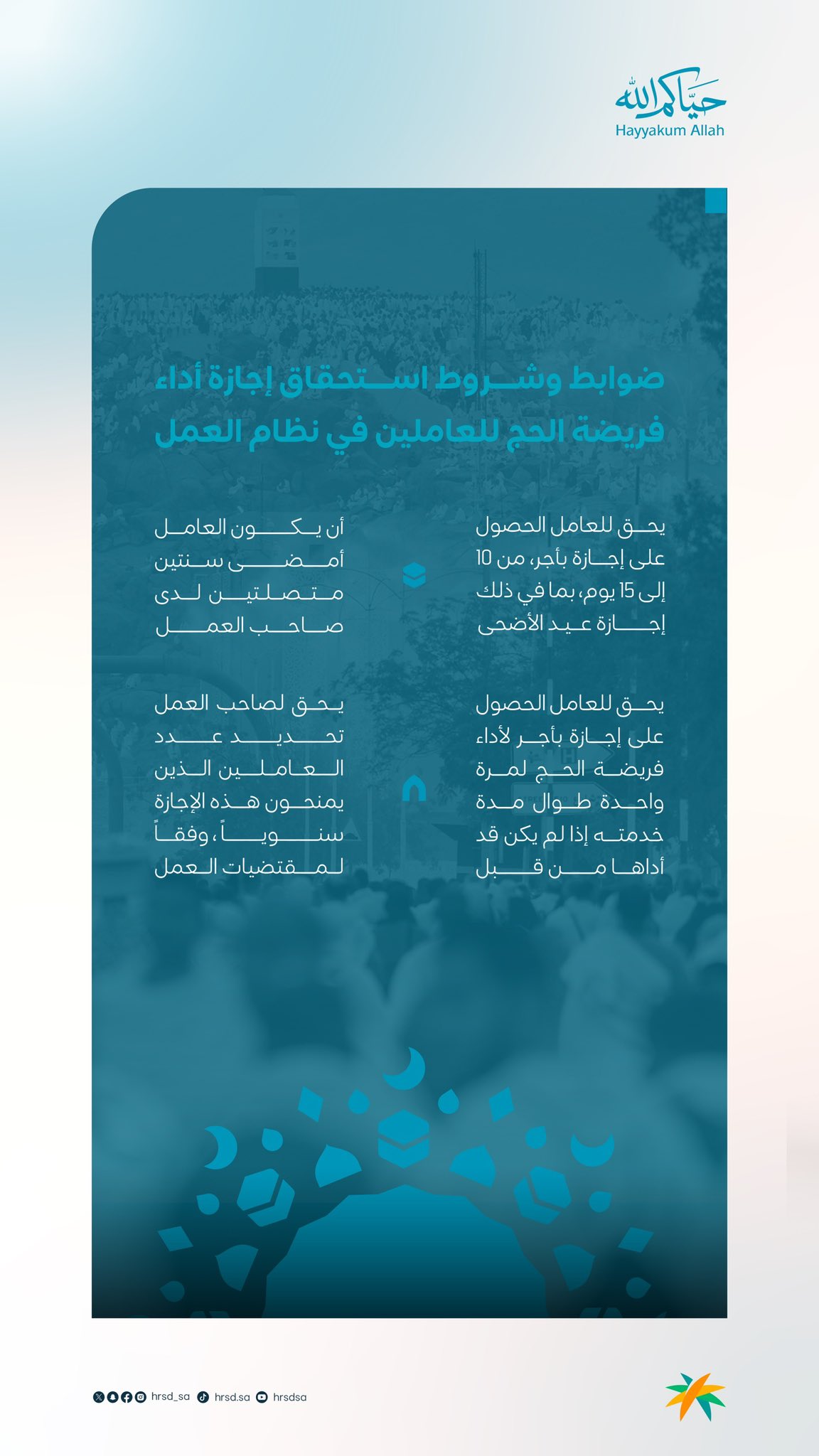 أعلنت وزارة الموارد البشرية والتنمية الاجتماعية، ضوابط وشروط استحقاق إجازة أداء فريضة الحج للعاملين في نظام العمل.