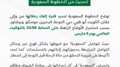 الاتجاه ـ متابعات أعلنت مجموعة الخطوط السعودية تمديد فترة إلغاء رحلاتها من وإلى عمان، والكويت، وأبو ظبي، ودبي، والدوحة، والبحرين، وموسكو،…