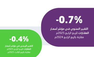 الاتجاه ـ متابعات شهد الرقم القياسي لأسعار العقارات في المملكة انخفاضًا خلال الربع الرابع من عام 2025م؛ بلغ 0.7 %مقارنةً…